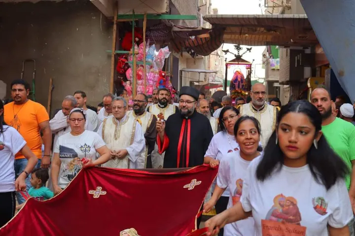 يطوف الآباء الكهنة الفرنسيسكان والأساقفة بين صفوف الكشافة يقرعون الطبول، مع لفيف من الشمامسة مُنشدين الترانيم والمدائح الكنسيّة والفلكلوريّة الخاصّة بالعذراء، فضلًا عن سرد مسيرتها من بشارتها حتى انتقالها. يطوفون في مسيرة مهيبة، حاملين أيقونة كبيرة للعذراء مريم، ويتبرّكون من هذا المكان الذي اختبأت فيه العائلة المقدّسة وقت هروبها من أورشليم إلى مصر.