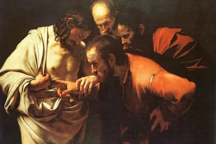 ولمّا ظهر المسيح للرسل بعد القيامة، لم يكن حينها توما معهم. وحين حضر، قالوا له: «قد رأينا الربّ. فقال لهم: إن لم أبصر في يديه أثر المسامير وأضع إصبعي في آثارها كما أضع يدي في جنبه لا أؤمن». صوّر في موقفه الثالث واقع الشك لبلوغ الحقيقة. بعد ثمانية أيّام، عاد المسيح إليهم، وتوما معهم وقال له: «هات إصبعك إلى هنا وأبصر يدي، وهات يدك وضعها في جنبي، ولا تكن غير مؤمن بل مؤمنًا». أجاب توما وقال له: «ربّي وإلهي!» قال له يسوع: «لأنك رأيتني يا توما آمنت! طوبى للذين آمنوا ولم يروا» (يو 20: 26-29). ولمّا حلّ الروح القدس في العلّية على الرسل، انطلقوا بعدها من أجل إعلان البشارة.