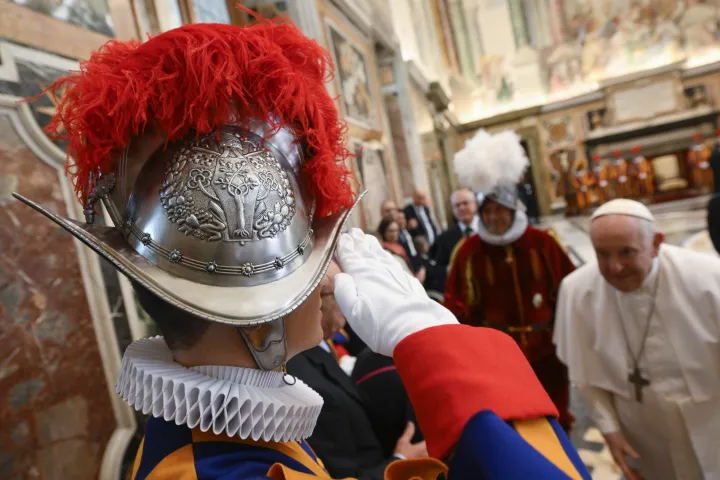 عبّر الأب الأقدس عن امتنانه للحراس لأنّهم حاضرون دائمًا للخدمة، وهم يشهدون عبر نشاطهم على وفائهم لخليفة بطرس. وصف الحبر الأعظم الحرس السويسري بالعائلة الكبيرة والجماعة الحيّة والأخويّة. واعتبر أن المنتسبين إلى الحرس يعيشون في جوٍّ من التنشئة الإنسانيّة والمسيحيّة إذ يمكن للشباب والمسنّين منهم أن يغنوا بعضهم البعض بخبراتهم.
