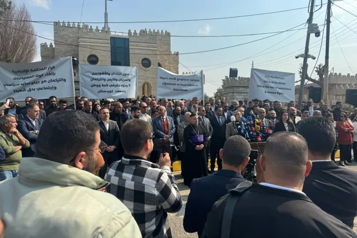 على وقع قرع أجراس كاتدرائية مار يوسف الكلدانية في قضاء عنكاوا-أربيل العراقيّة، نُظِّمت صباح اليوم تظاهرة احتجاجًا على القرارات الأخيرة للمحكمة الاتحادية العليا للبلاد.