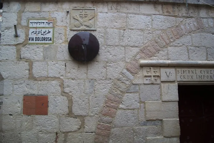 أمّا المرحلة الخامسة، «سمعان القيرواني يعين يسوع على حمل الصليب»، فيُشار إليها في نقش منحوت أعلى بوابة الكنيسة الفرنسيسكانية. وتشير إلى موقع المرحلة السادسة، «القديسة فيرونيكا تمسح وجه يسوع بالمنديل»، الكتابة الموجودة على بوابة كنيسة الروم الكاثوليك.