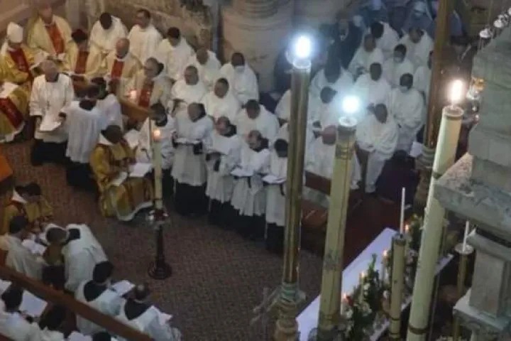التي امتنعت انشادها الكنائس الغربية في زمن الصوم الأربعيني، وبعد القداس كان هناك دورة حول قبر المسيح، وبعد انتهاء الدورة عاد الموكب نفسه الى البطريركية ولكن بفرح اكبر، حينها تبدأ الاحتفالات بالفصح، فالمؤمنين الذين احتفلوا بالقدس (صلاة العيد) يمكنهم إيقاف صيامهم اما بالنسبة لاحتفال رعايا بيت لحم وأريحا وغزة، يبدأ القداس مساءاً وينتهي الصيام بعد القداس في حين تحتفل الكنائس في محافظات رام الله وجنين ونابلس بعيد الفصح المجيد حسب التقويم الشرقي، في الرابع والعشرين من شهر أبريل، والجدير بالذكر، أن قداسة البابا يحتفل بسبت النور (العشية الفصحية ) مساءاً.
