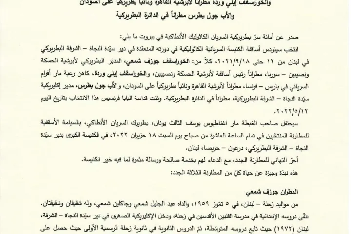 انتخب سينودوس أساقفة الكنيسة السريانية الكاثوليكية في دورته المنعقدة في دير سيّدة النجاة – الشرفة البطريركي في لبنان من 12 حتى 18/9/2021، كلاً من: الخور أسقف جوزف شمعي، المدبّر البطريركي لأبرشية الحسكة ونصيبين – سوريا، مطراناً رئيس أساقفة لأبرشية الحسكة ونصيبين، والخور أسقف إيلي وردة، كاهن رعية مار أفرام السرياني في باريس – فرنسا، مطراناً لأبرشية القاهرة ونائباً بطريركياً على السودان، والأب جول بطرس، مدير إكليريكية سيّدة النجاة – الشرفة البطريركية، مطراناً في الدائرة البطريركية. وثبّت قداسة البابا فرنسيس هذا الانتخاب بتاريخ اليوم .12/5/2022
