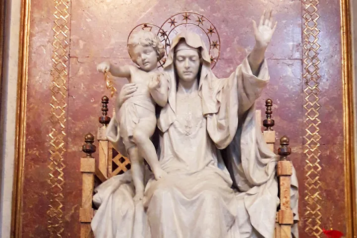 وكان البابا بندكتس الخامس عشر أراد تلك المنحوتة في العام 1918 لطلب شفاعة سيّدة السّلام من أجل نهاية الحرب العالميّة الأولى. المنحوتة عمل فنّي لغويدو غالّي، نائب رئيس متاحف الفاتيكان في حينها. تُظهر المنحوتة العذراء مريم سيّدة السّلام رافعةً يدها اليُسرى لوقف عاصفة الحرب المُستعرة، بينما تضمّ في يدها اليُمنى الطفل يسوع الذي يحمل بيده غضن زيتون، علامة السّلام. عند قاعدة التمثال نُحتت ورودًا تُمثّل الحياة المزهرة من جديد مع عودة السّلام.