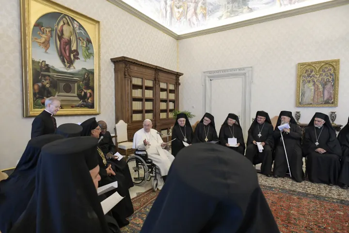 استقبل البابا فرنسيس اليوم صباحًا، في القصر الرسولي في حاضرة الفاتيكان، البطريرك يوسف العبسي الذي ترأس وفد أعضاء سينودس كنيسة الروم الملكيين الكاثوليك الذي يُعقد هذا العام في كنيسة القدّيسة مريم المزيّنة في روما. وبعد كلمة البطريرك العبسي أمام البابا، ألقى الأب الأقدس كلمته أمام أعضاء السينودس باللغة الإيطاليّة.
